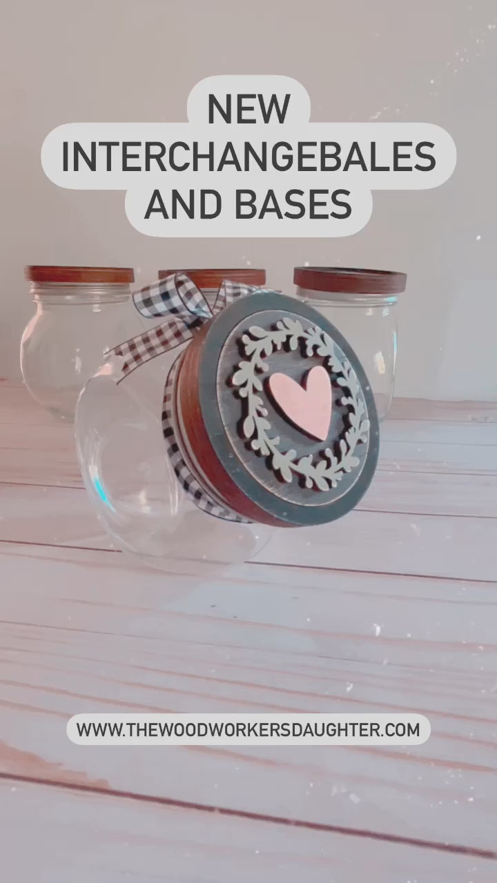 Candy Jar with Interchangeable Lids - a fun versatile piece, perfect for every holiday, season and occasion! The lid is crafted from laser cut Baltic Birch and hand painted, it features seasonal interchangeable 3" inserts (sold separately). Would make a great addition to your coffee bar! Measures approximately 3.5"x5".
