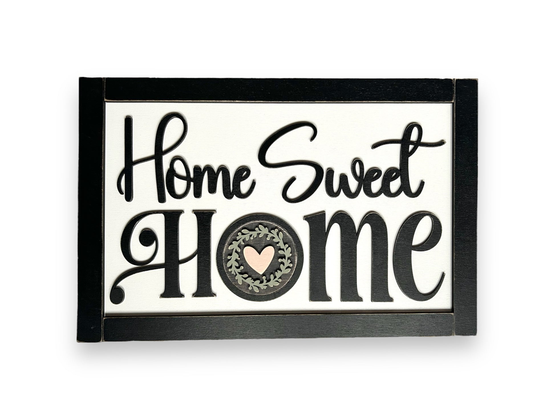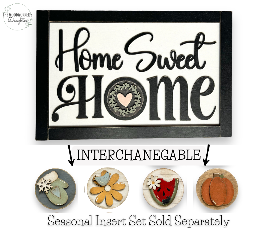 Our Interchangeable Home Sweet Home sign, is the perfect addition to any home! Crafted from laser cut Baltic Birch and hand painted, it features seasonal interchangeable 3" inserts (sold separately). This versatile and fun piece measures 10.5"x16" and can be hung on a wall or displayed on a shelf or mantle.