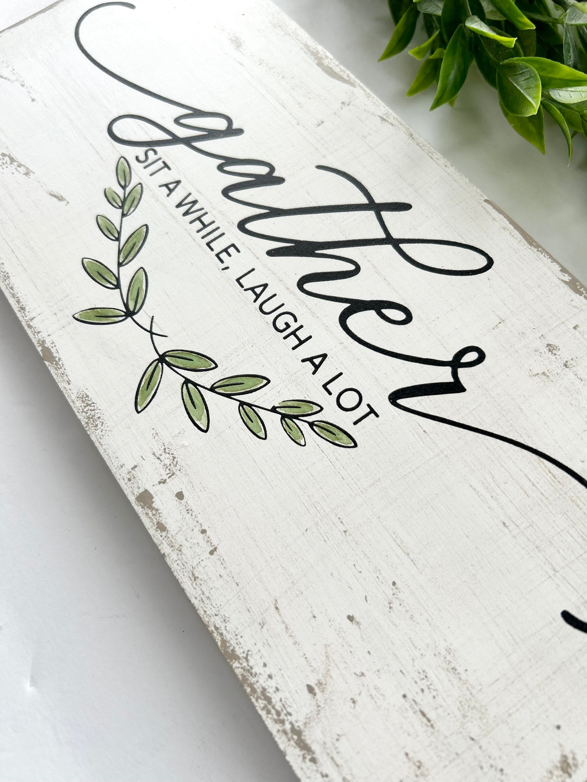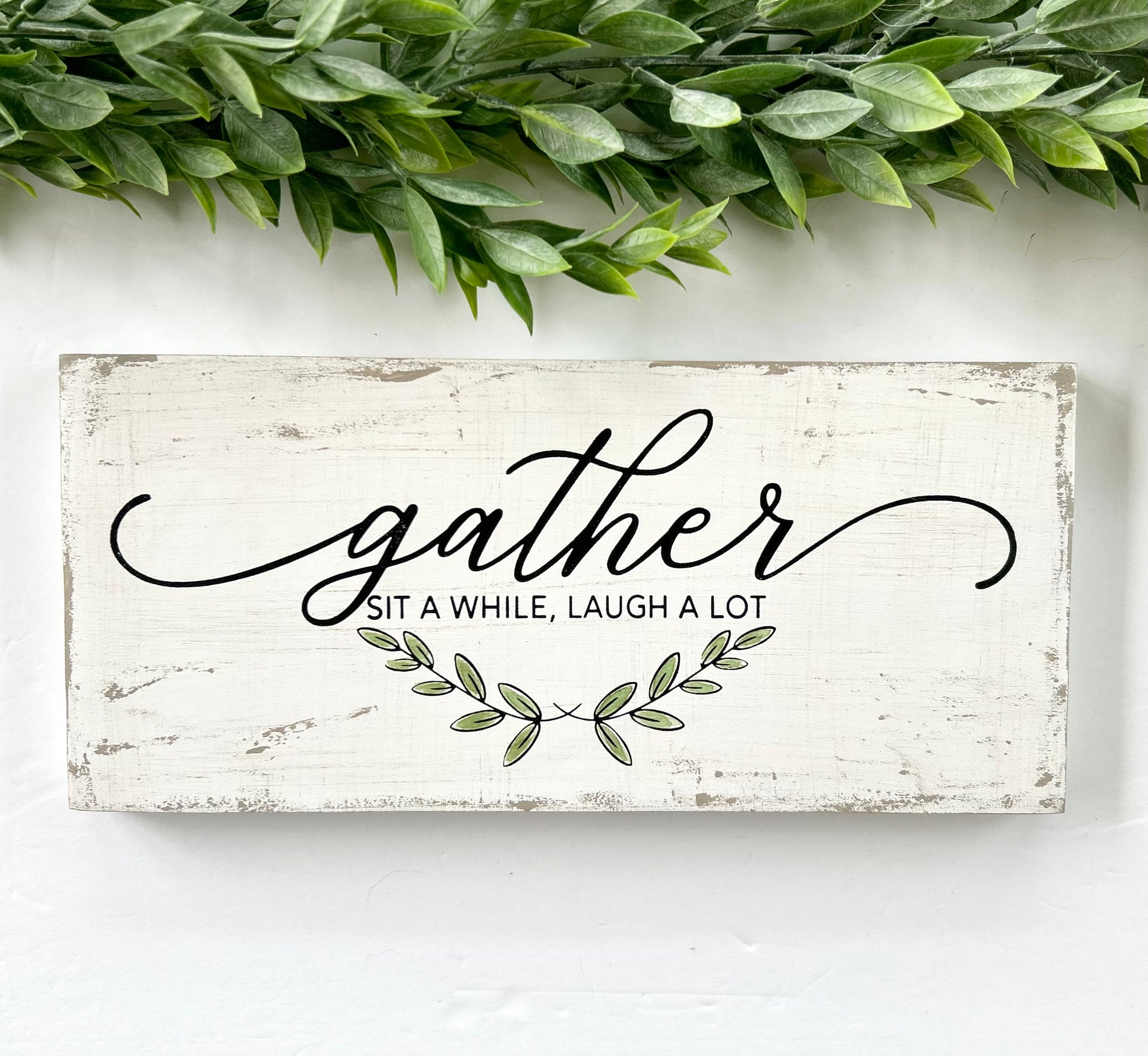 Measuring 5.5"x12", this Gather - Sit a While, Laugh a Lot wood sign is the perfect home decor piece to add a touch of farmhouse charm to any room. Handcrafted with premium pine wood, it features water colored leaves and a distressed background for an authentic rustic look. Display on a shelf or table in your family room or dining room.
