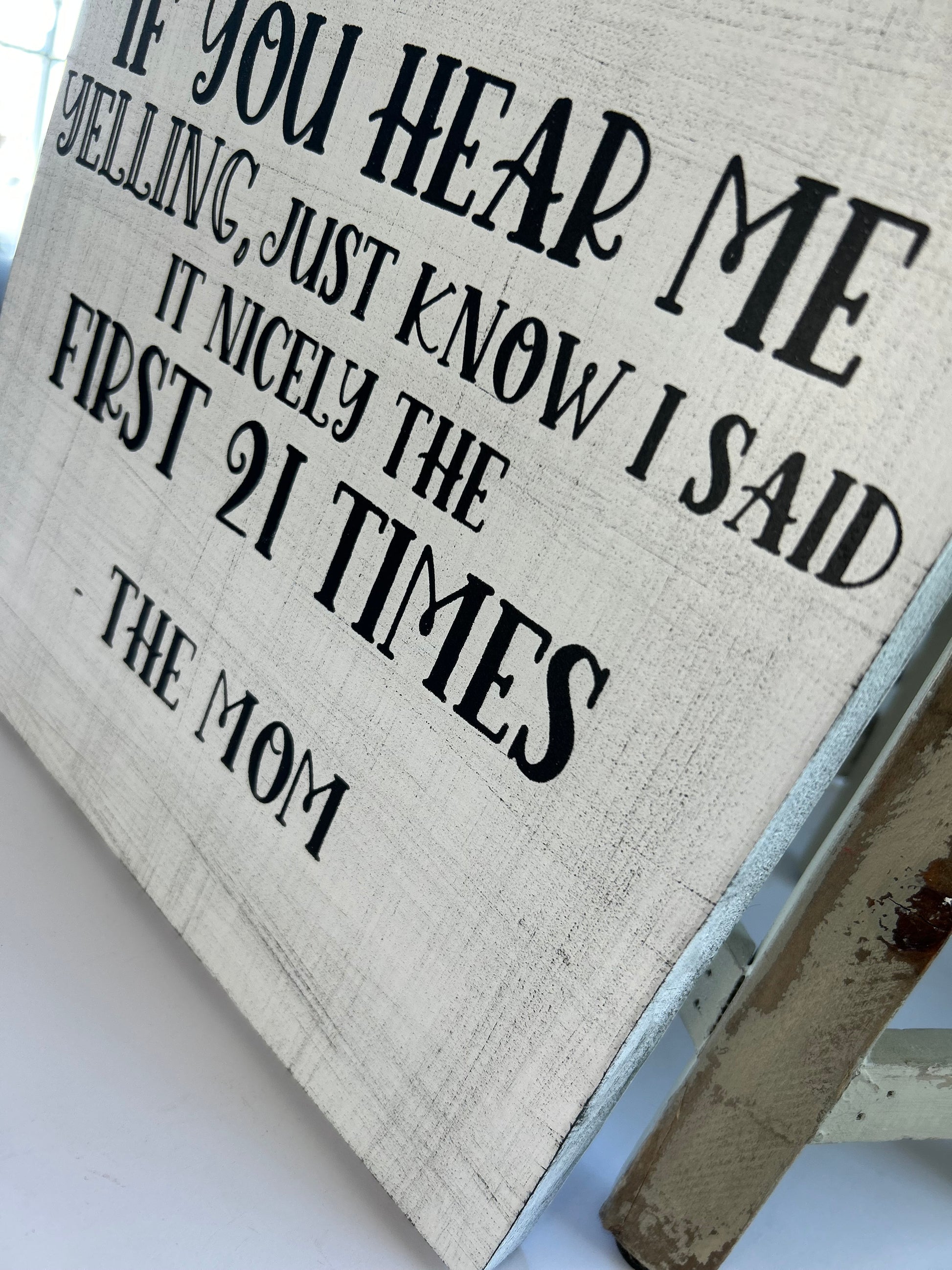This hand-painted wood sign features a classic rustic farmhouse style. Constructed of premium pine wood, it comes complete with a sawtooth hanger and white distressed background. Made in NH, this humorous sign is the perfect way to remind everyone that busy moms often have to repeat themselves--just remember, she said it nicely the first 21 times!